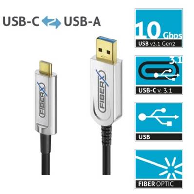 prix HT à l'unité Les câbles fibre USB-C vers USB-A sont conçus pour une transmission optimale des signaux USB sur de longues distances. La construction hybride, composée de conducteurs en fibre optique et en cuivre, permet des longueurs de câble nettement plus longues que les câbles en cuivre USB-C vers USB-A conventionnels. Ceci est possible en transmettant les données USB via des fibres optiques, qui sont exemptes d'influences / interférences électromagnétiques et sont uniquement complétées par des fils de cuivre pour la transmission de puissance. Grâce à cette conception hybride, les câbles de cette série sont disponibles pour des longueurs de câbles très longues entre 5,00 m et 30,00 m, tout en pouvant être utilisés dans des environnements complexes. Les câbles sont conformes à la norme USB SuperSpeed USB 10 Gbps (également appelée SuperSpeed+ ou USB 3.0 / 3.1 / 3.2 Gen2) et sont capables de transférer des données jusqu'à 10 Gbps ou 900 Mo par seconde. Ils ne sont pas compatibles avec les spécifications USB héritées, telles que USB 2.0 / 1.1. Le petit diamètre de câble de seulement 4,5 mm permet un rayon de courbure extrêmement serré allant jusqu'à 45 mm (statique) ou 90 mm (dynamique), ce qui les rend particulièrement utiles pour la pose / installation dans des environnements étroits, tels que l'arrière d'un rack. En raison de sa construction hybride, ce câble ne peut pas être utilisé pour les profils USB Power Delivery. La puissance maximale transmise est de 5V avec 0,9A pour un potentiel de charge maximum de 4,5W. L'utilisation prévue de ce câble est de connecter des caméras USB et / ou d'autres appareils de conférence USB, tels que des webcams ou des téléphones de conférence numériques avec le matériel d'exploitation situé loin.l